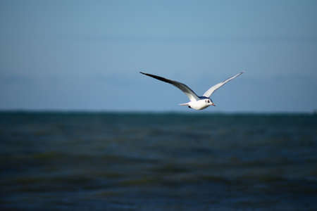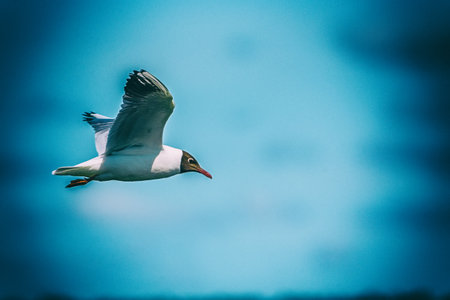 Black-headed seagulls, Chroicocephalus ridibundus, are flying over the blue waters of the Dnieper river in Kiev the capitol of Ukraine