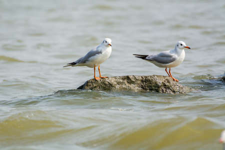 Two white seagulsl perching at the stone at Shenzhen Bay, China