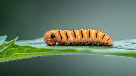 A detailed macro shot showcases an orange caterpillar with black markings resting on a vibrant green leaf.