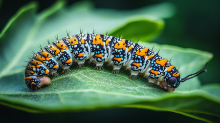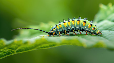 A vibrant caterpillar with striking colors rests on a lush green leaf. This close-up captures the beauty of nature and the intricate details of wildlife.