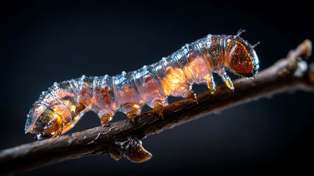 Caterpillar on a branch with water drops on a black background