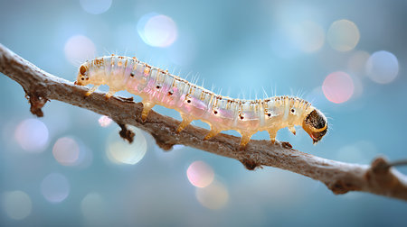 A bright blue and yellow caterpillar delicately crawls along a thin branch, showcasing intricate details against a dreamy blurred background, revealing the beauty of nature.