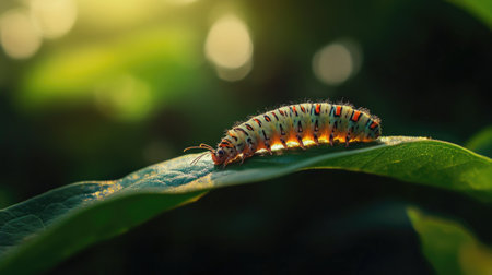 A vibrant caterpillar rests on a green leaf, showcasing the beauty of nature. Sunlight filters through foliage, creating a serene atmosphere.