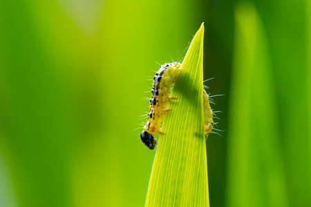 Caterpillar of the Lepidoptera on a green leaf