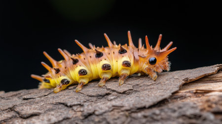 Extreme macro showing caterpillar spiked body and detailed skin patterns, crawling on a bark-covered twig