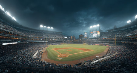 A lively baseball stadium scene showcases a packed crowd and a well-maintained field, surrounded by towering lights and an intense sky, creating an electrifying ambiance