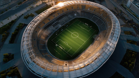 Stunning aerial view of a modern stadium showcasing a lush green football field bathed in warm sunset light. Ideal for sports-related projects and concepts.