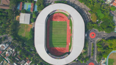 Aerial top down view of the Beautiful scenery of Manahan Solo Stadium. with cityscape background. Solo, Indonesia, July 1, 2021