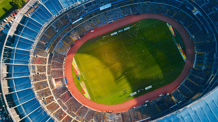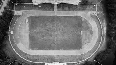 Aerial top view of a stadium with no people focusing on the field track and surrounding stands. Copy space available