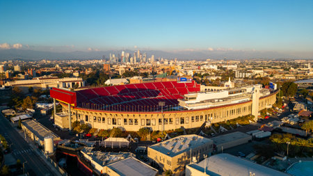 Los Angeles, CA - November 17, 2023: Los Angeles Memorial Coliseum, home to USC football, Olympics and other events, with Los Angeles skyline in the background