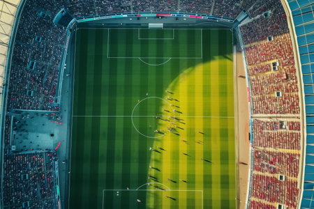 An aerial shot capturing a packed football stadium, vibrant green pitch, and excited fans under bright lights.