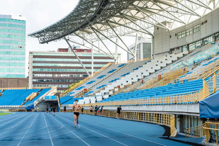 Athletes wearing a mask are training at the Taipei Municipal Stadium in Taiwan. here is a multi-purpose stadium in Taipei.