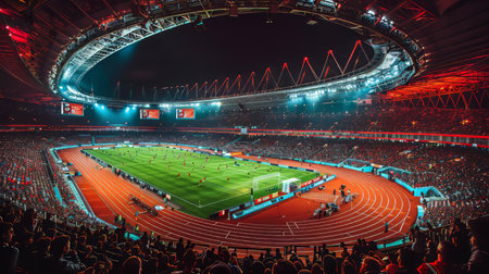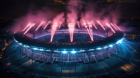 A stunning aerial shot of a vibrant stadium at night, filled with excited spectators. The bright lights illuminate the field, creating a captivating scene.