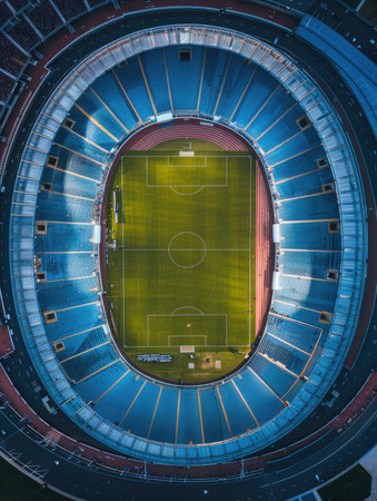 Stunning aerial view of a modern stadium featuring a vibrant green soccer field and empty stands during sunset in an urban setting. Ideal for sports themes.