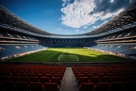 A captivating perspective of an empty soccer stadium featuring a well-maintained grass field, capturing the essence of sports and architecture under a clear blue sky.