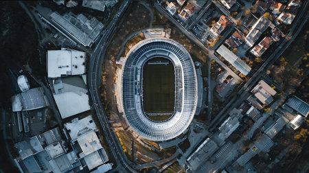 Captivating aerial view of a stadium nestled in an urban landscape during sunset. The golden hour light illuminates the cityscape, creating a serene yet vibrant atmosphere.