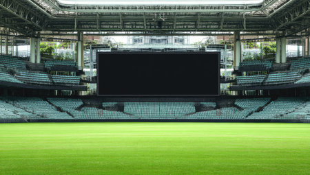Empty sports stadium with rows of teal colored seats. A large blank screen is positioned on the center background. A manicured grassy field covers the foreground.