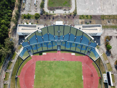 Aerial drone top down view of soccer stadium. Football stadium with running field shot with drone at Phuket Thailand