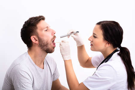 Young Female Doctor Checking Man's Sore Throat With Tongue Depressor