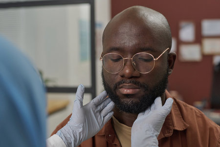 Black man sitting with his eyes closed while unrecognizable doctor examining his lymph nodes