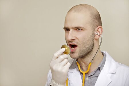 Oropharyngoscopy procedure. Otolaryngologist examines woman throat with spatula. Consultation with laryngologist
