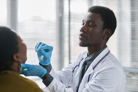 Side view portrait of young black doctor consulting patient in clinic and doing throat exam for flu