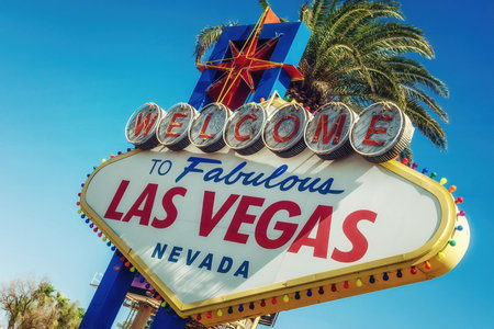Welcome sign to the stunning landscape of Las Vegas. Iconic Welcome to Fabulous Las Vegas sign stands tall against a backdrop of palm trees. landmark, sights, hotels and landscapes of Las Vegas