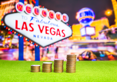Stack of coins with blur Las vegas sign on background
