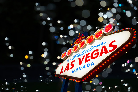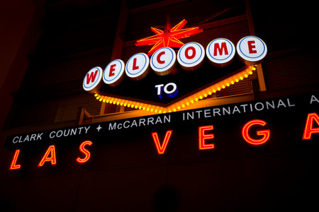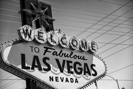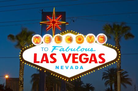 Welcome to fabulous Las Vegas retro neon sign in gambling tourist resort, USA. Iconic vintage glowing banner, symbol of casino, games of chance, money playing and hazard bets. Illuminated signboard.