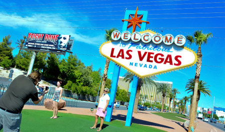 Tourists standing by Welcome to Fabulous Las Vegas sign, Nevada, USA