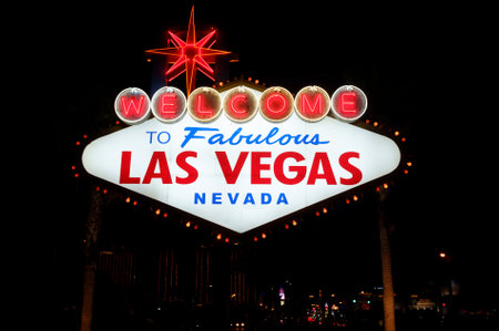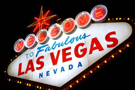 Welcome to fabulous Las Vegas retro neon sign in gambling tourist resort, USA. Iconic vintage glowing banner, symbol of casino, games of chance, money playing and hazard bets. Illuminated signboard.