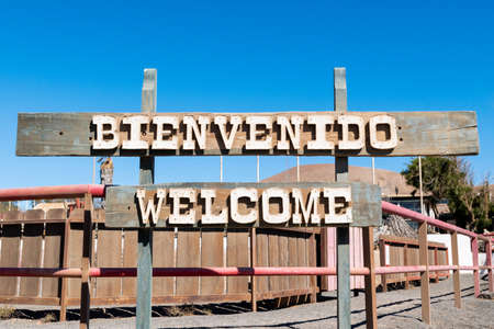 Wooden welcome sign with blue sky, on the volcanic island of Lanzarote, Canary Islands, Spain