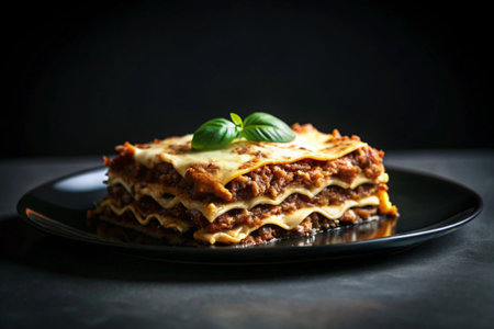 Delicious lasagna with meat sauce and cheese on dark background, hd photography of food, delicious bolognese pasta in the style of seihebricommerce stock photo contest winner. High quality photo