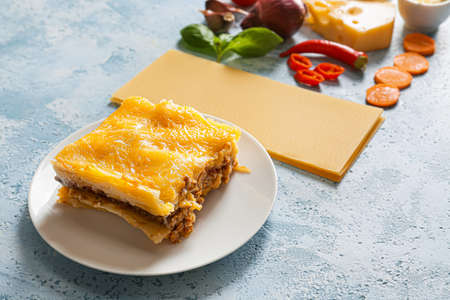 Piece of tasty hot lasagna served on a plate. Italian cuisine, menu, recipe. Homemade meat lasagna.