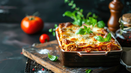 A mouthwatering dish of homemade lasagna, layered with rich tomato sauce, melty cheese, and vibrant herbs, perfect for any culinary occasion.