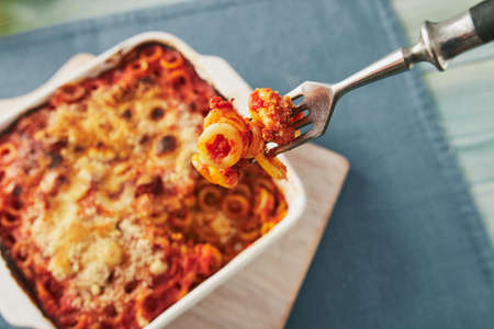 Baked anelletti pasta with mince, sauce and mozzarella. Typical sicilian dish