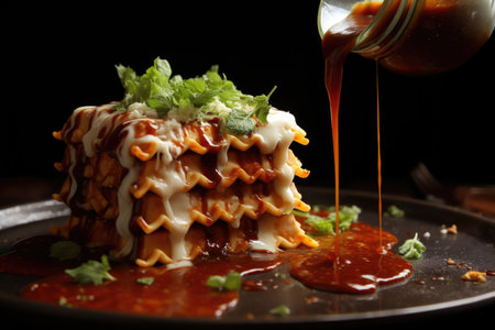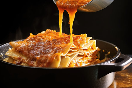 pouring tomato sauce onto lasagna noodles, created with generative ai