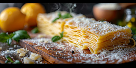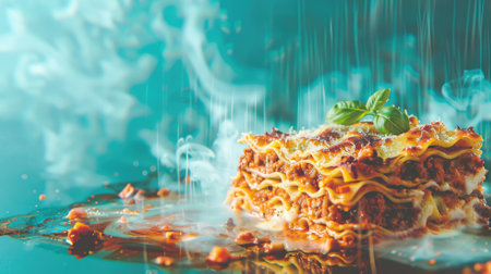 Steaming lasagna with herbs, cheese, and sauce on vibrant background