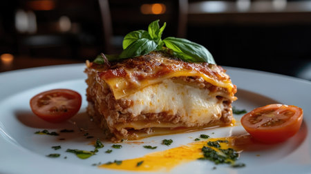 A mouthwatering slice of lasagna topped with melted cheese and garnished with fresh basil on a stylish plate, perfect for showcasing culinary art.
