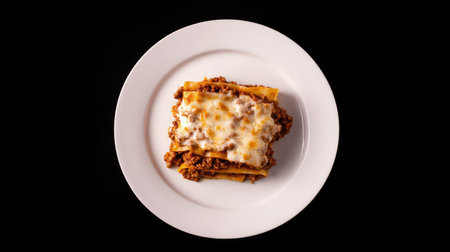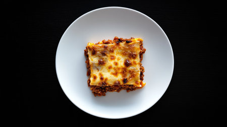 A top-down view of a hearty lasagna with minced beef and rich bolognese sauce, served on a white plate against a black background, emphasizing the comfort and indulgence of this classic Italian dish