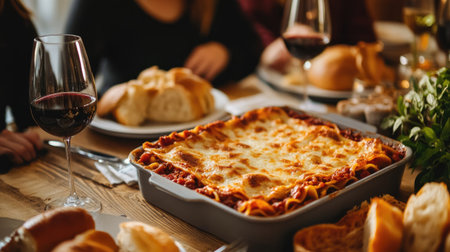 A cozy Italian family dinner table with a large tray of homemade lasagna, fresh bread, and red wine.