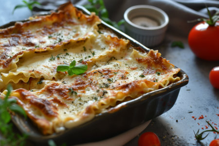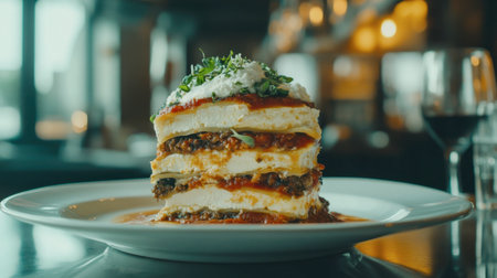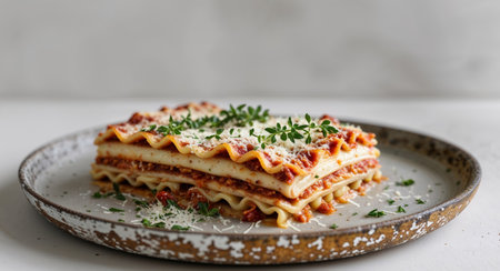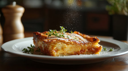A beautifully presented serving of layered pasta topped with rich cheese and herbs. Perfect for showcasing culinary delights in food photography.
