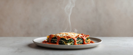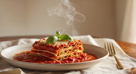 AI Generated. Steaming plate of lasagna served in rich tomato sauce garnished with fresh basil at a cozy dining table