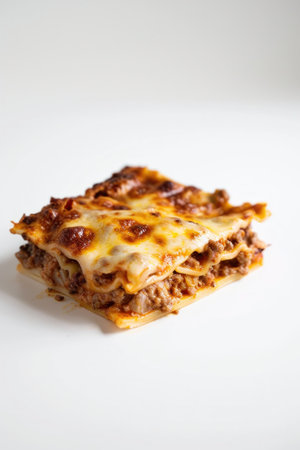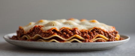 A top-view image of a lasagna slice on a simple plate, with melted cheese and rich meat sauce, surrounded by clean copy space on a minimalist background for added design elements.