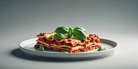 A delectable lasagna dish beautifully plated with fresh basil, showcasing layers of rich ingredients. Perfect for gourmet dining or home cooking.