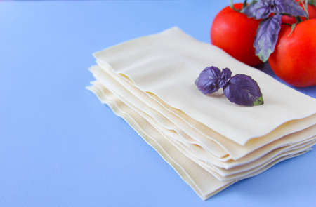 Lasagne sheets pasta with tomato and basil leaf on a blue background. Ingredients for an italian recipe. Copy space. High quality photo