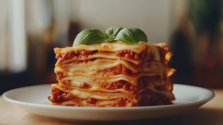 A mouthwatering slice of homemade lasagna, perfectly layered with rich meat sauce and topped with fresh basil, served on a plate. Ideal for culinary visuals.