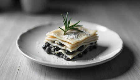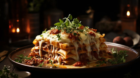 AI Generated. Delicious creamy lasagna served on a rustic plate with herbs and cheese topping