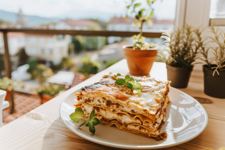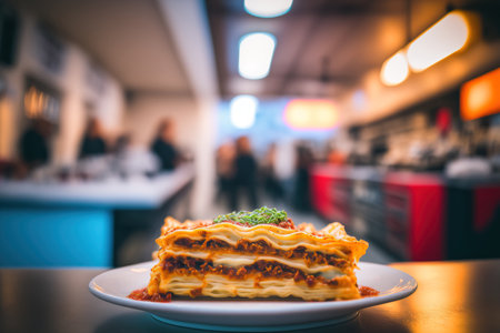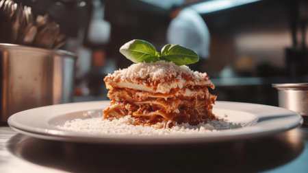 Delicious lasagna on white plate with cozy kitchen background and cheesy layers in focus