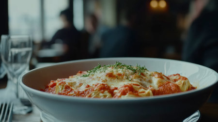 A beautifully presented bowl of pasta topped with rich tomato sauce and melted cheese, garnished with fresh herbs. Perfect for food lovers.